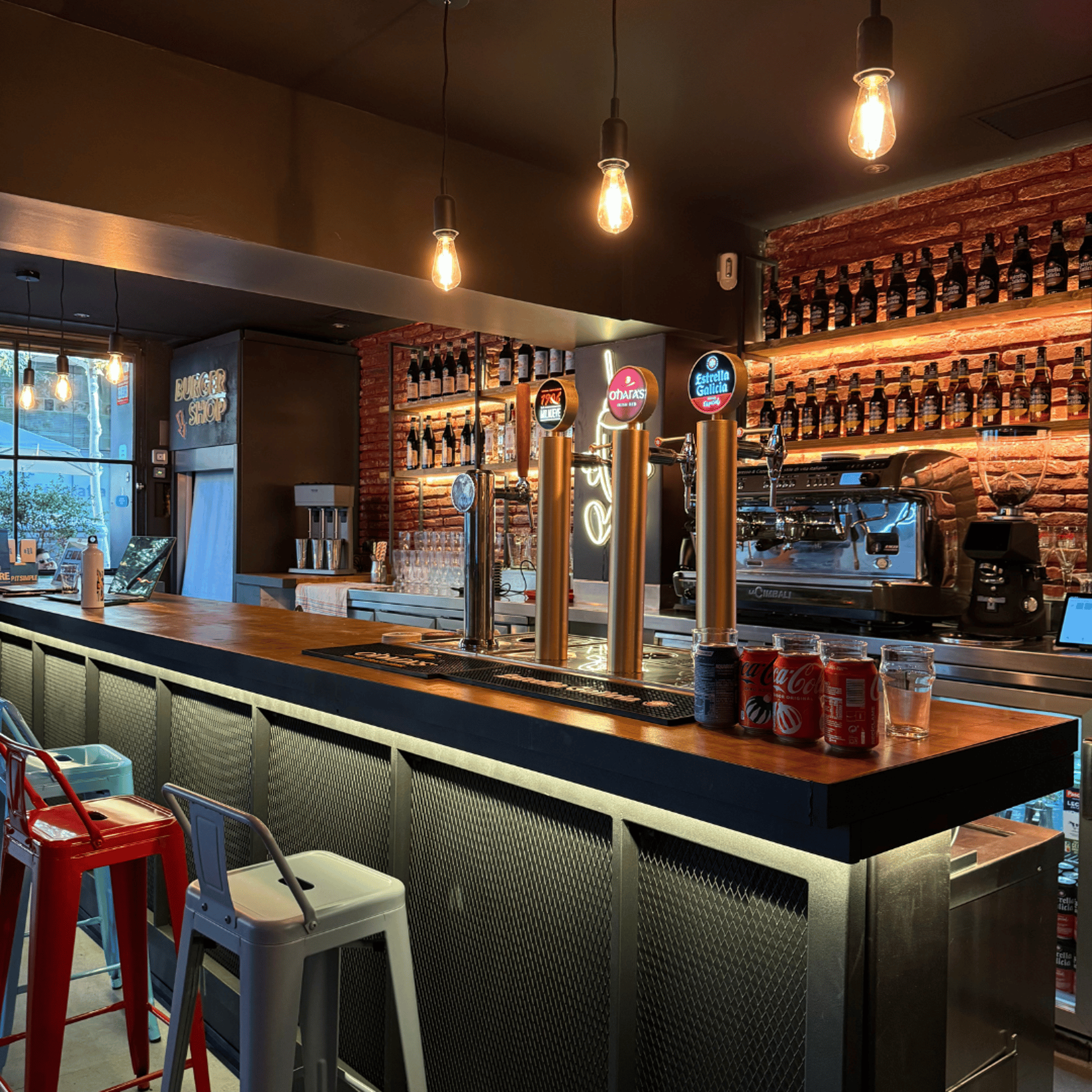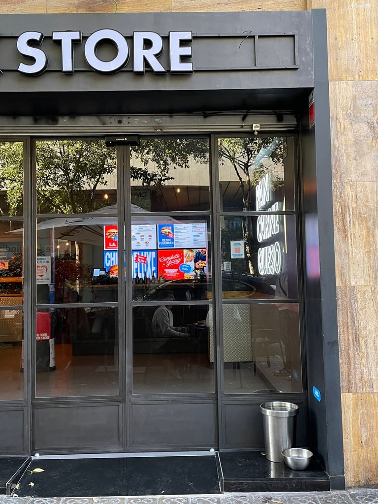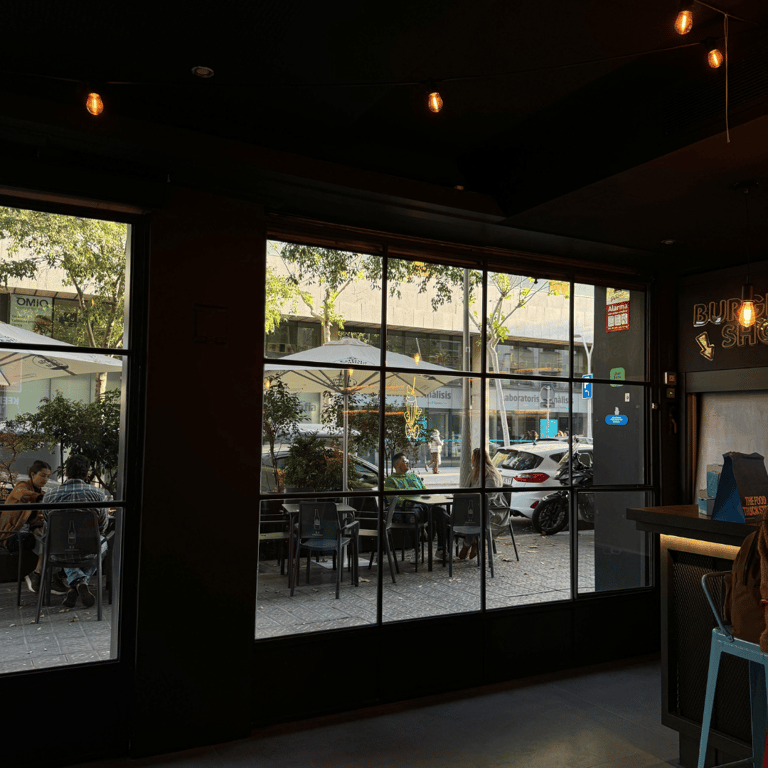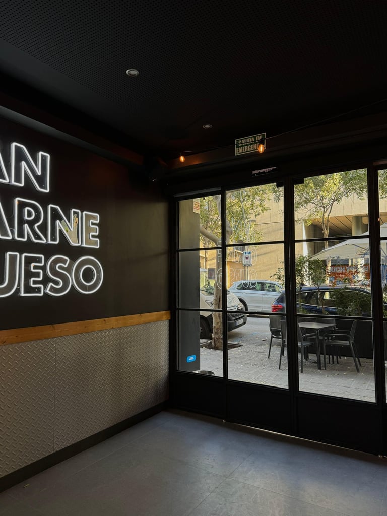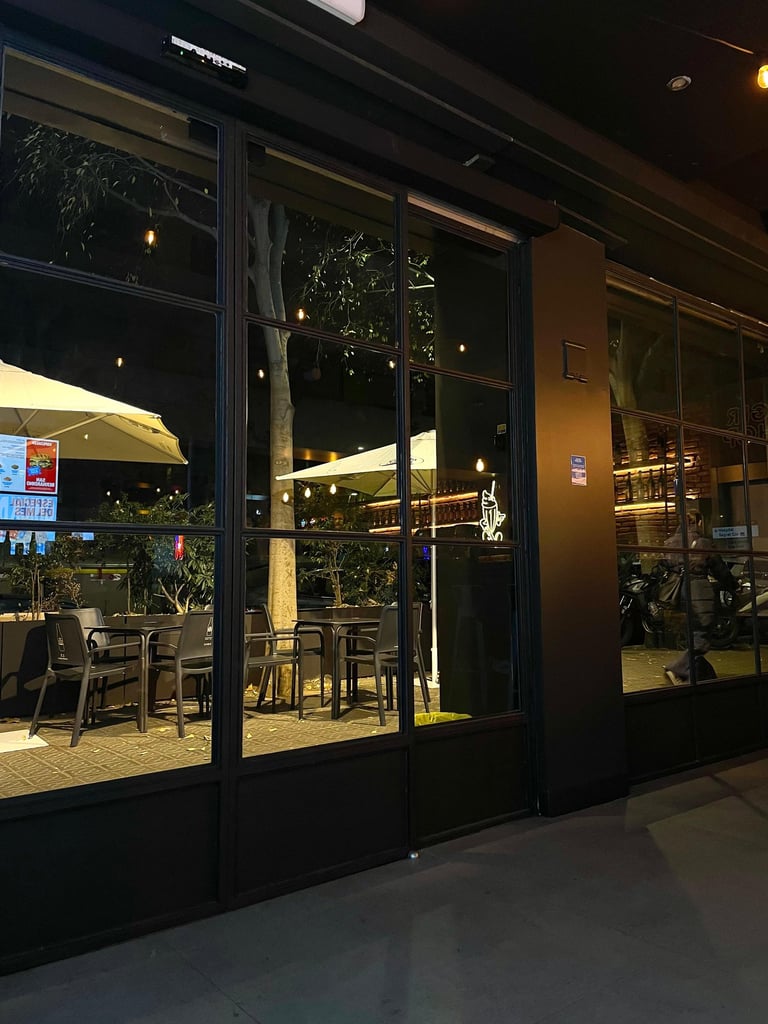 El alcance del proyecto incluyó el diseño y fabricación de la barra principal del local, mesas personalizadas para el área de comedor y el desarrollo de la entrada en cristal partido, compuesta por paños de vidrio con estructura metálica. Cada elemento fue diseñado específicamente para el espacio, priorizando durabilidad, facilidad de mantenimiento y una estética coherente con el carácter urbano e industrial del restaurante.